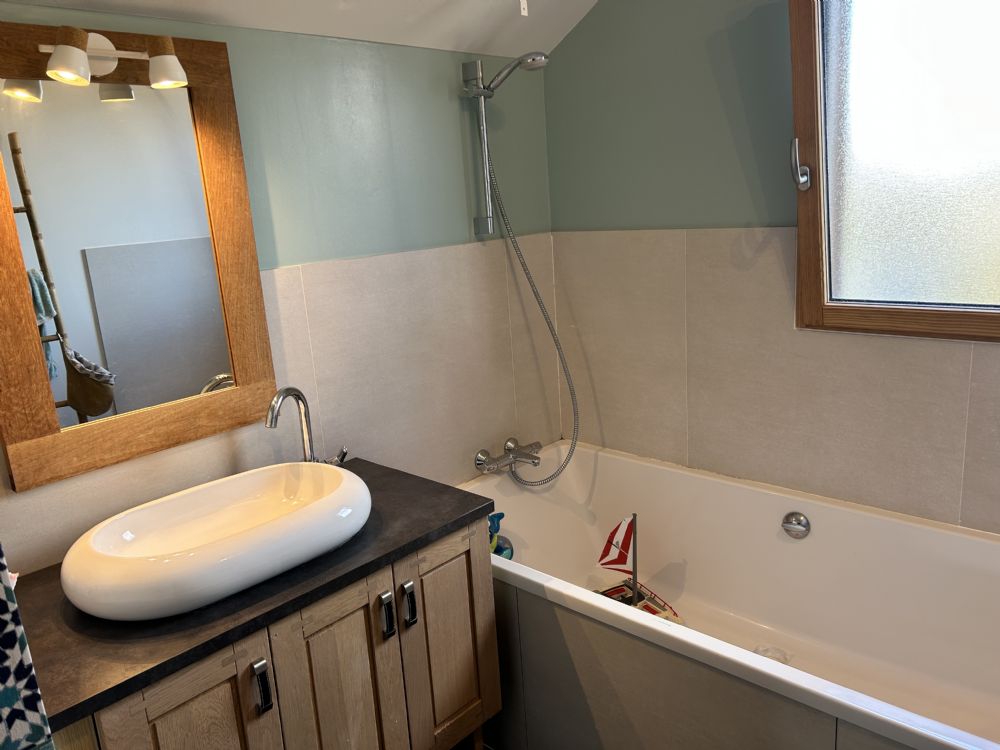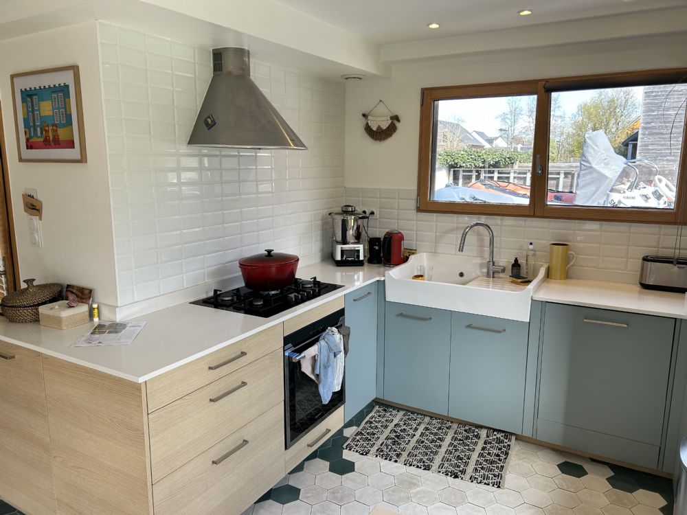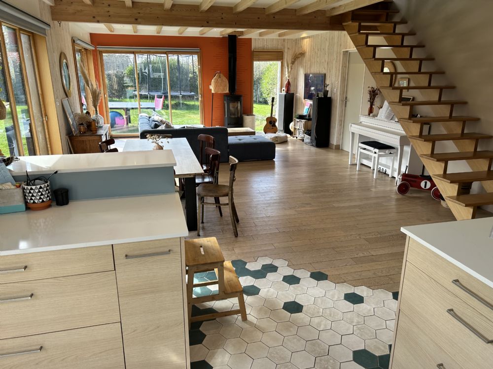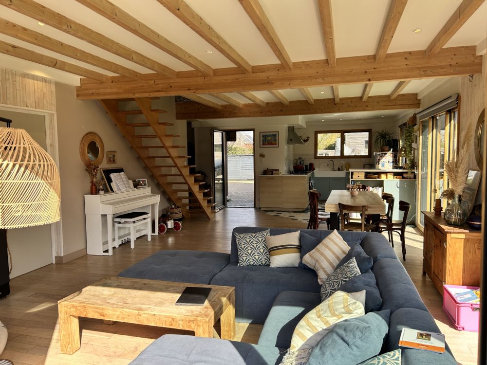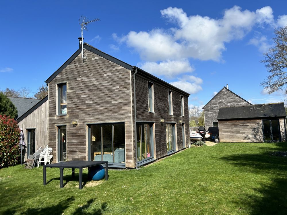 Nous vous proposons de découvrir cette maison moderne édifiée en ossature bois d'une surface habitable d'environ 133 M². La grande pièce à vivre avec sa cuisine ouverte est baignée de lumière grâce à ses baies exposées sud / ouest sans vis à vis. le rez-de chaussée comprend une suite parentale avec salle d'eau et dressing qui vous offre une vie de plain-pied, buanderie et wc. A l'étage dégagement bureau, trois chambres, salle de bains et wc. La dépendance se compose du garage et d'une pièce isolée à finir d'aménager selon vos besoins. Terrain d'environ 645 M² avec une cour pouvant accueillir plusieurs véhicules. Situation au calme en impasse à 10 minutes à pied de la plage et commerces et 200 mètres de l'école. Coté pratique et économique le poêle à bois suffit à chauffer la maison, VMC double flux et cuve de récupération des eaux de pluie enterrée.